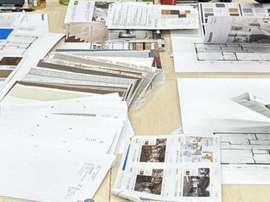 実際のキッチンの面材や床材、カーテン、壁紙などの内装のカラーサンプルを切り取り、LDKの平面図の書かれた台紙に貼り込んでコーディネイトし、