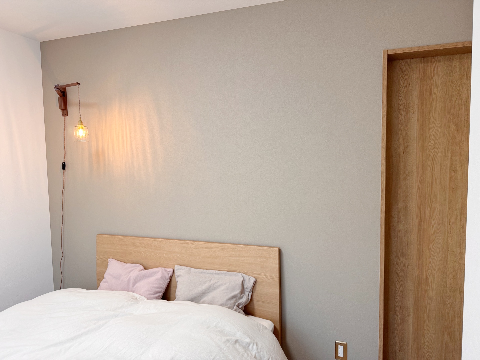 寝室のドアの色味と合わせて統一感が出、クロスの淡いグレーと調和して、優しい自然の風合いが癒される空間になりました。