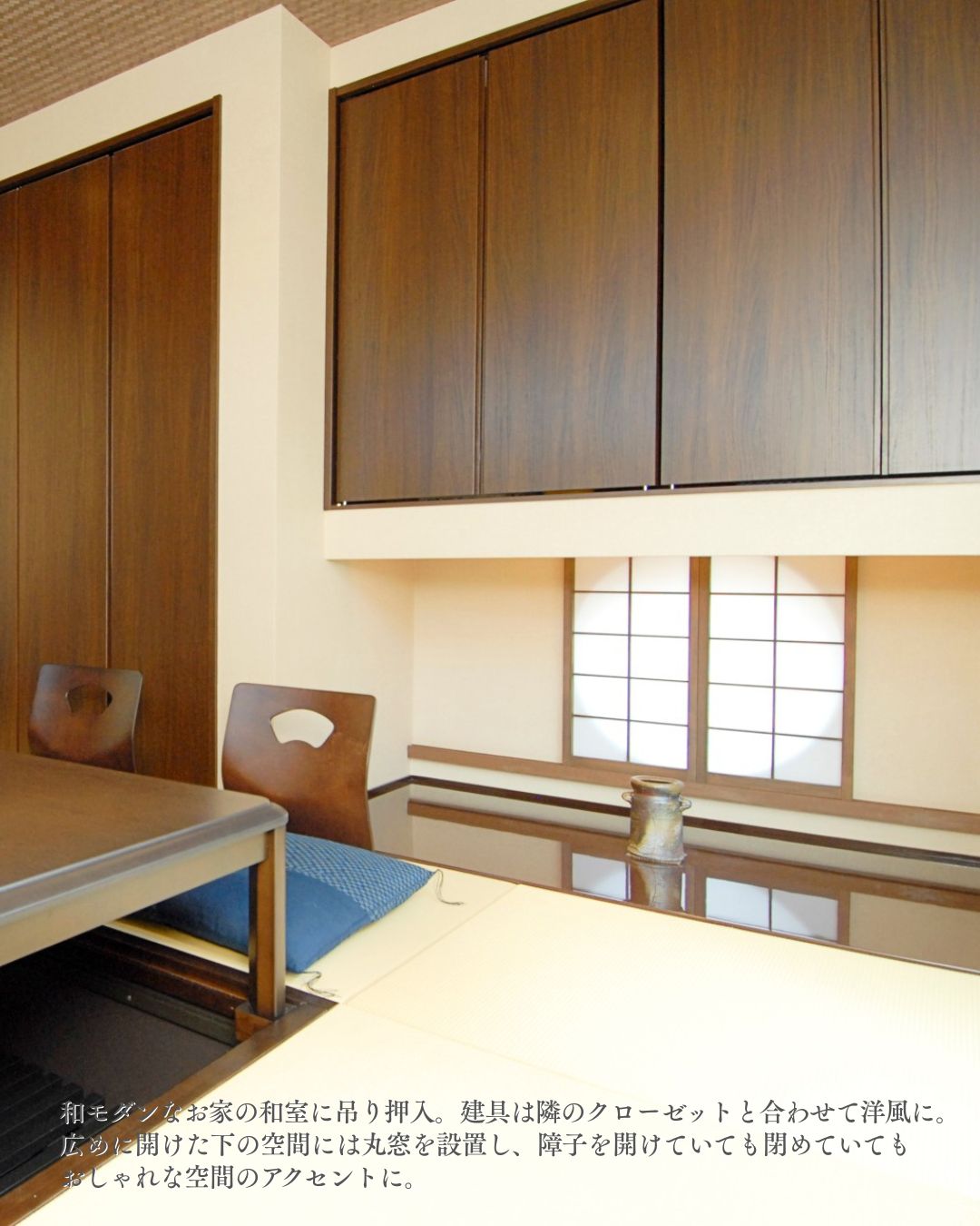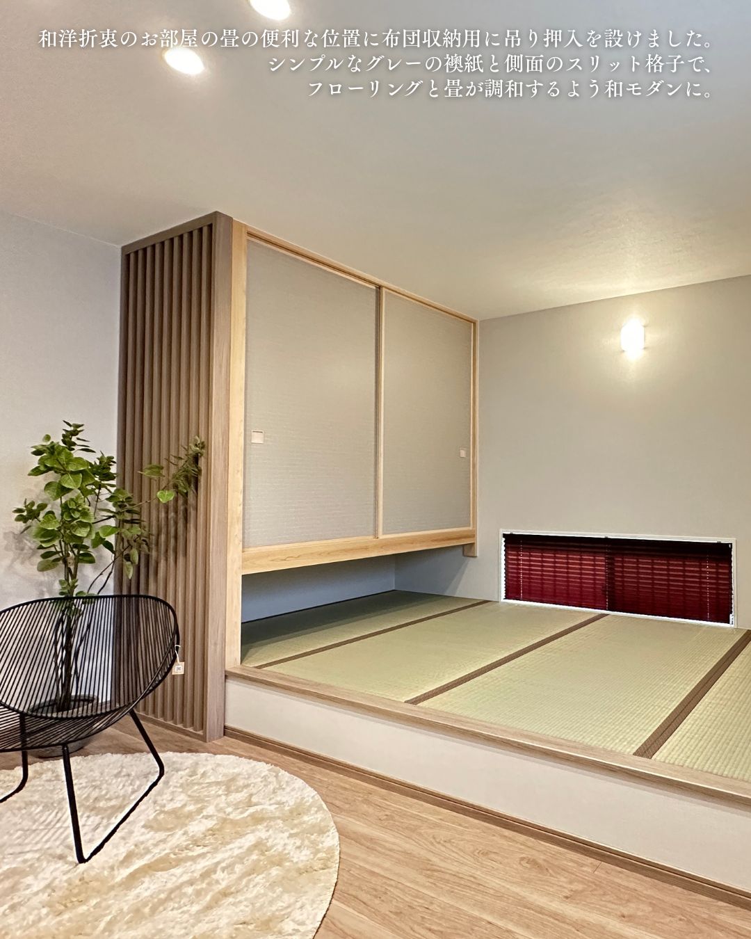 畳の上の便利な位置に、布団収納用に吊り押入を設け、シンプルなグレーの襖紙と側面に付けたスリット格子で、