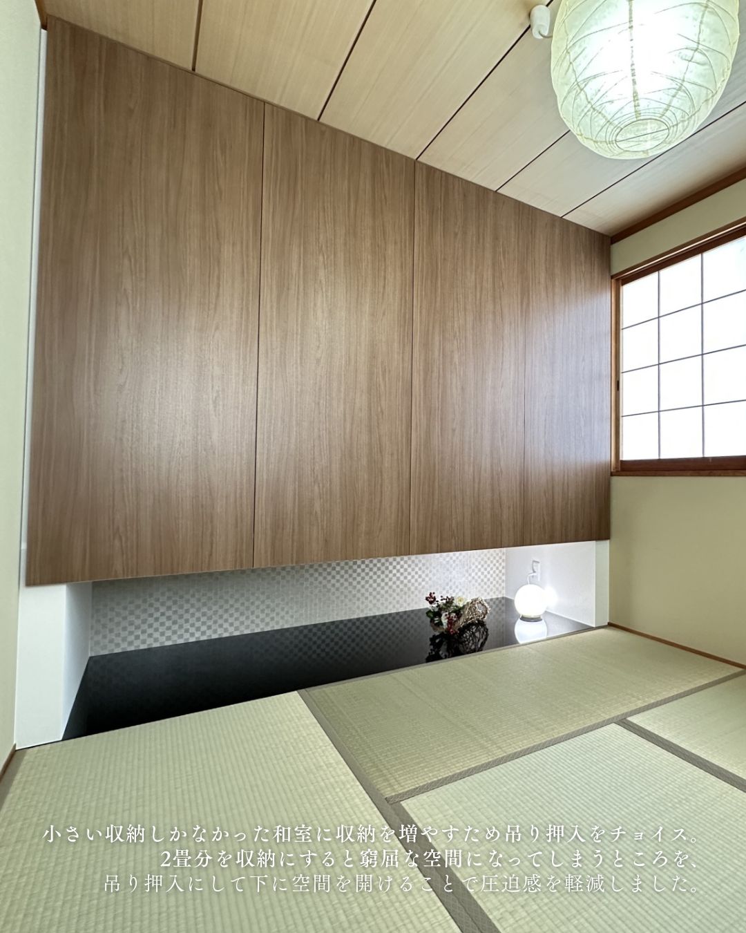 新しい収納を〈吊り押入〉にすることで、下に空間を開けて圧迫感を軽減しました。