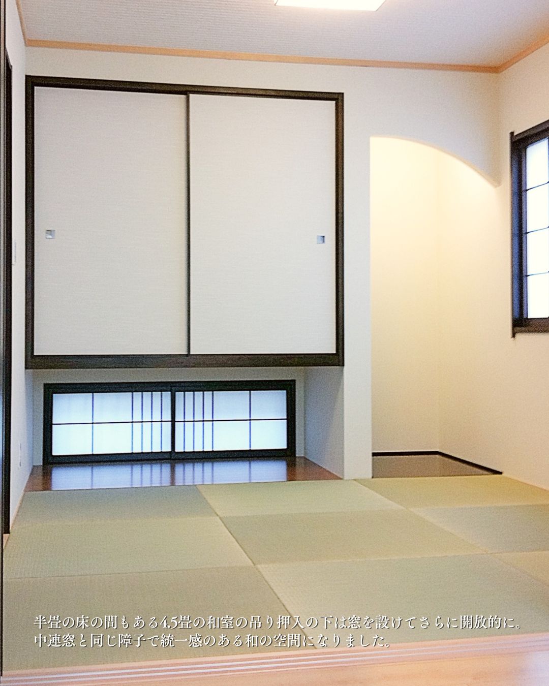 半畳の床の間もある4.5畳の和室の吊り押入の下は、窓を設けてさらに開放的に。